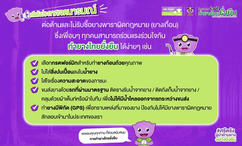 ศรีตรังประกาศเจตนารมณ์ ต่อต้านและไม่รับซื้อยางพาราผิดกฎหมาย (ยางเถื่อน) ซึ่งเกษตรกรทุกคนสามารถร่วมแรงร่วมใจกัน ทำยางไทยยั่งยืน ได้ง่ายๆ เช่น