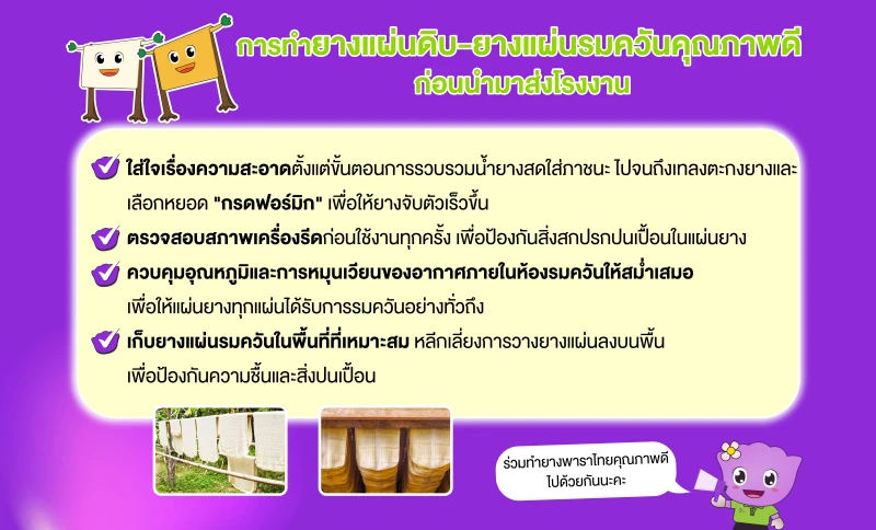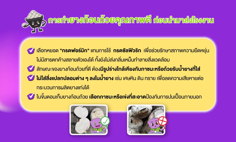 - ใส่ใจเรื่องความสะอาดตั้งแต่ขั้นตอนการรวบรวมน้ำยางสดใส่ภาชนะ ไปจนถึงเทลงตะกงยางและเลือกหยอด "กรดฟอร์มิก" เพื่อให้ยางจับตัวเร็วขึ้น