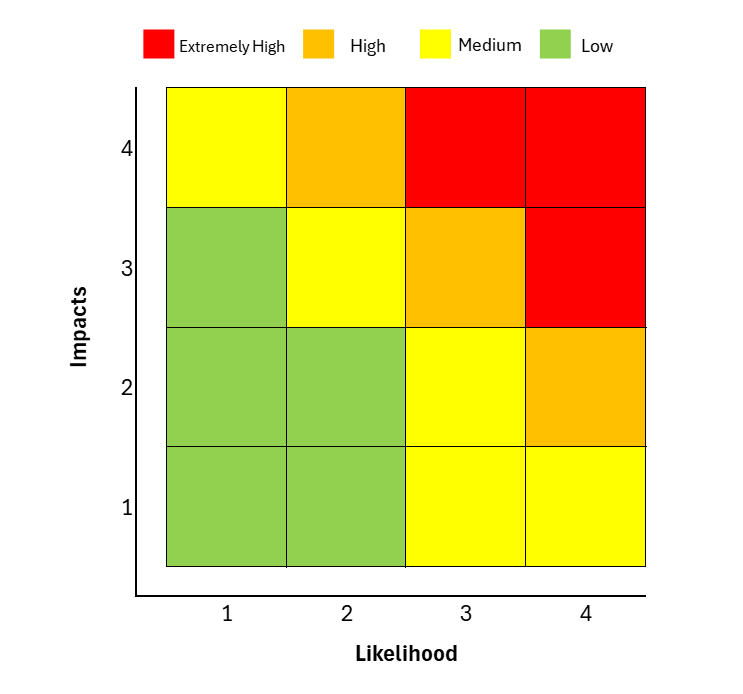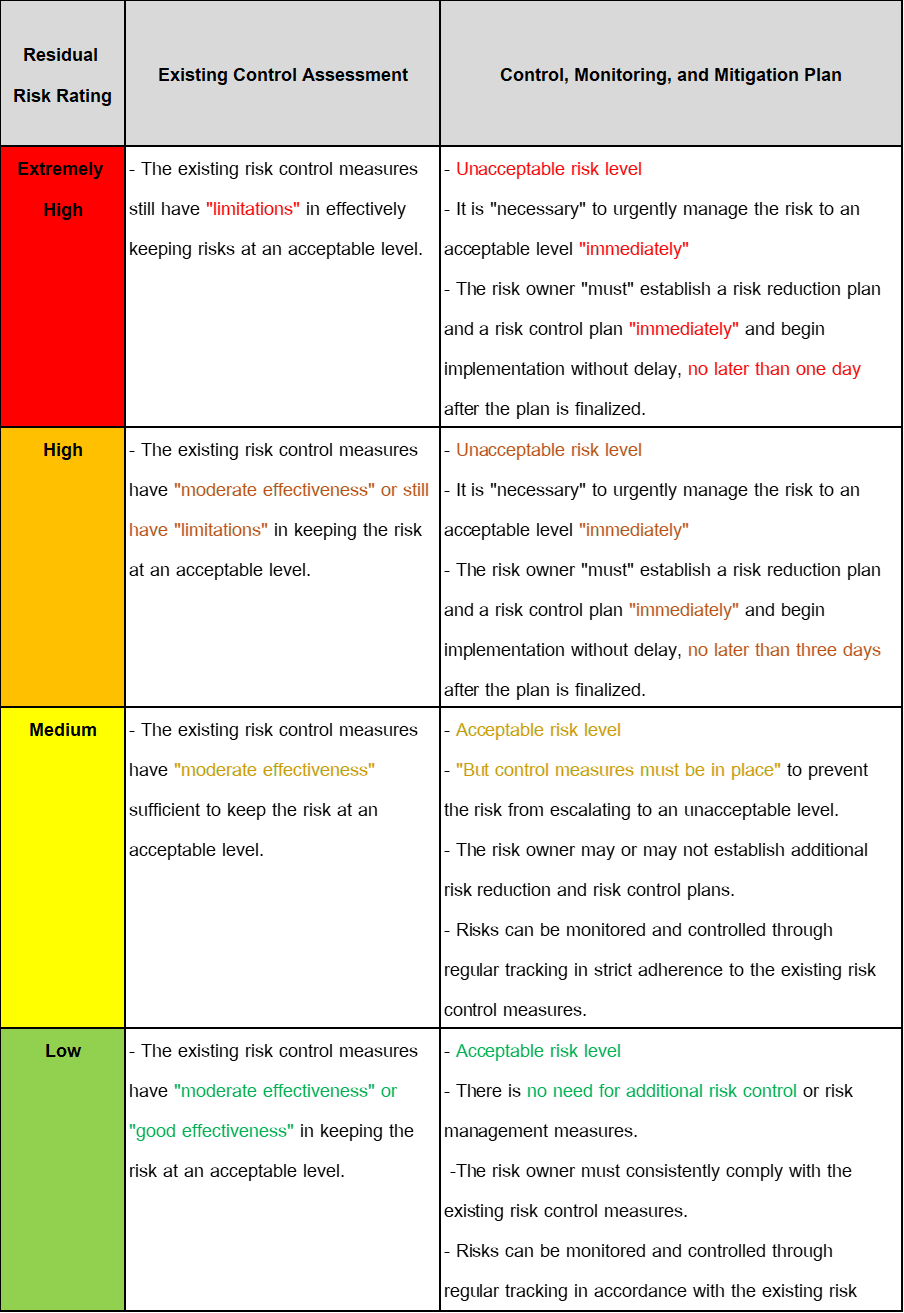 The likelihood assessment is a criterion used alongside risk level to assist evaluators in decision-making. The likelihood assessment criteria are divided into the following levels: low, medium, high, and very high likelihood.