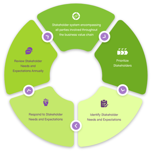 The company places great importance on stakeholder engagement by establishing guidelines for stakeholder participation. These guidelines aim to ensure that responses to the expectations of all stakeholder groups are accurate, appropriate, and relevant. The engagement process consists of the following 5 steps: